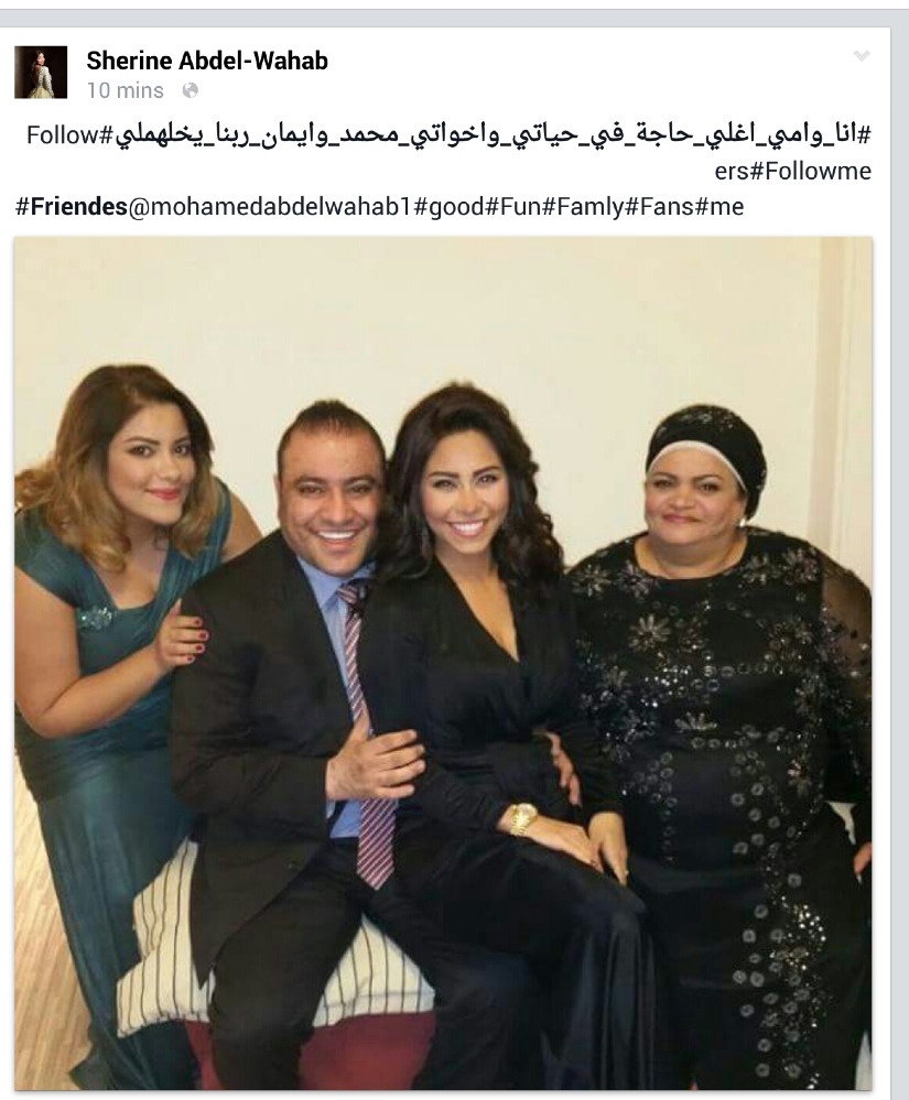 رغم أن النجمة شيرين عبد الوهاب نشرت من قبل العديد من الصور مع والدتها ، وصور أخرى مع شقيقتها إيمان ، كما نشرت مؤخراً صور لها مع شقيقها محمد ، لكنها المرة الأولى التي تجمع فيها كل هؤلاء بجوارها في لقطة واحدة وتنشرها ، مؤكدة على أهمية العائلة في حياتها ، وعلقت : "أنا وامي اغلى حاجه في حياتي واخوتي محمد وايمان ربنا يخلمهلي."