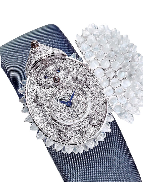 تحفة فنيّة جديدة تقدمها Chopard ضمن مجموعة Animal World Collection وهي ساعة Hedgehog الرائعة التي أبدعت بابتكارها. انها عبارة عن ساعة ماسية خفيّة مصنوعة من الذهب الأبيض عيار 18 قيراطاً وتأخذ شكل قنفذ متلألئ مع غطاء شائك من أحجار القمر. وقد تطلب تنفيذ هذه الساعة مهارة وجهد مجموعة كاملة من أبرع حرفيي صناعة المجوهرات الراقية لهذه الدار.