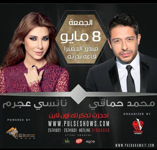 في الكويت يلتقي النجمان نانسي عجرم ومحمد حماقي لإحياء حفلة غنائية ضخمة، في الثامن من أيار (مايو) الجاري، تقام بفندق الجميرا بمناسبة ختام فعاليات معرض النخبة العقاري، الذي يقام حالياً في الكويت.