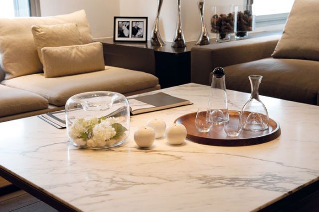 في الجلسة المخصّصة للمدفأة التي تعمل على الغاز، المقاعد وثيرة من الجلد البني الفاخر، تتوسطها طاولة مربّعة كبيرة من الرخام الأبيض الموشّى بالرمادي. أما المدخنة فمن الزجاج، بحيث يمكن الاستمتاع برؤية النار والدخان يتراقصان ليبعثا الدفء في أرجاء المنزل.