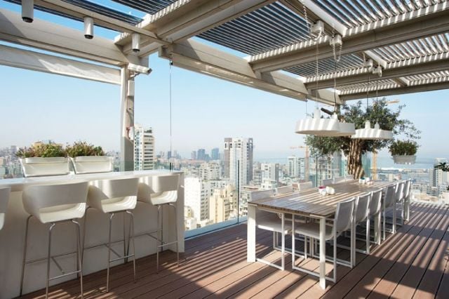 هذه الشقة الممتدّة على مساحة 650 متراً مربّعاً، هي الطبقة العلوية من مبنى عملاق في وسط بيروت، وقد حوّل المهندس سطحها إلى «ترّاس» مقسّم إلى جلسات صيفية تحوطها الأشجار الخضراء والمثمرة، كشجر الزيتون، وكلّها منسقة بطريقة هندسية لافتة.