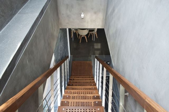 ويذكّرنا كلّ هذا المشهد بالأجواء الطبيعية، ولا سيما في الطبقة العلوية التي يوصلنا إليها درج من الخشب المنقوش والمزخرف، إطاره من الستينلس، توّج انسجام المواد المختلفة المستعملة لإنجاح هندسة هذه الشقة.