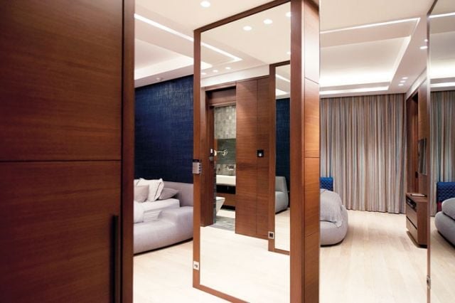 تطالعنا هنا مكتبة ضخمة على طول الجدار، ضمّت مجموعة من الكتب، وتوسّطها جهاز تلفاز عملاق كشاشات السينما، وهو ما جعل الجوّ أكثر استرخاءً، ورفاهية وترفيهاً. قسم من المكتبة يلعب دور الباب، يُشغّل كهربائياً فيُفتح ليقودنا إلى جناح غرف النوم.
