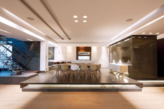 ولأن المساحة رحبة، تقصّد المهندس أن يجعل غرفة الطعام أعلى مستوى من الصالونات، فاستحدث لها درجة من «الكونكريت» السهل التنظيف.