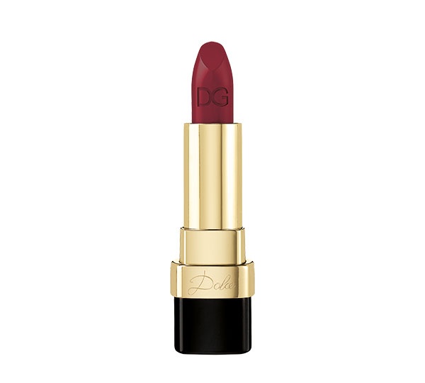 حددي شفتيك بقلم Chanel Aqua Crayon Lip Contour Stick in Red Brown، ثم غلفيهما بأحمر الشفاه المطفأ والطويل الثبات Dolce & Gabbana Matte Lipstick in Desire no.643.