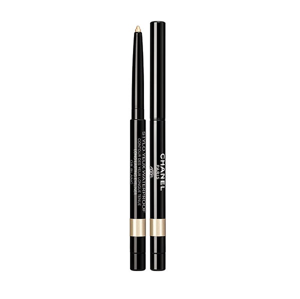 حددي جذور الرموش العليا بقلم الكحل المائي Bobbi Brown Ink Liner Blackest Black، وكحّلي الجفن الداخلي للعين بقلم الكحل الأبيض الذي يوسّع النظرة Chanel Stylo Yeux Waterproof Long-Lasting Eyeliner in Or Blanc.