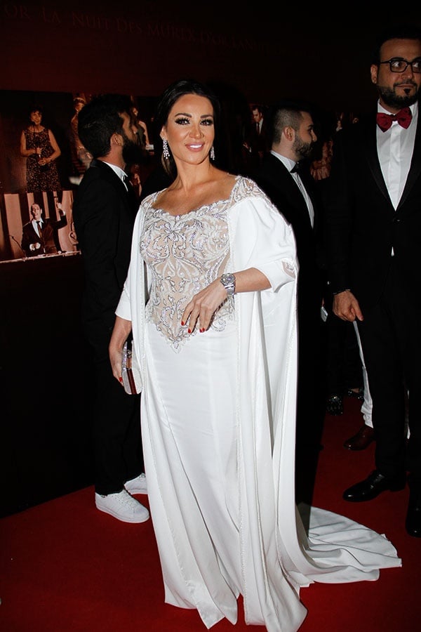 اختارت أصالة إطلالة رترو كلاسيكية من تصميم نيكولا جبران. فتألقت بفستانٍ أبيض أكمامه طويلة وزيّن جانبه بالأورغانزا السوداء على طول الفستان.