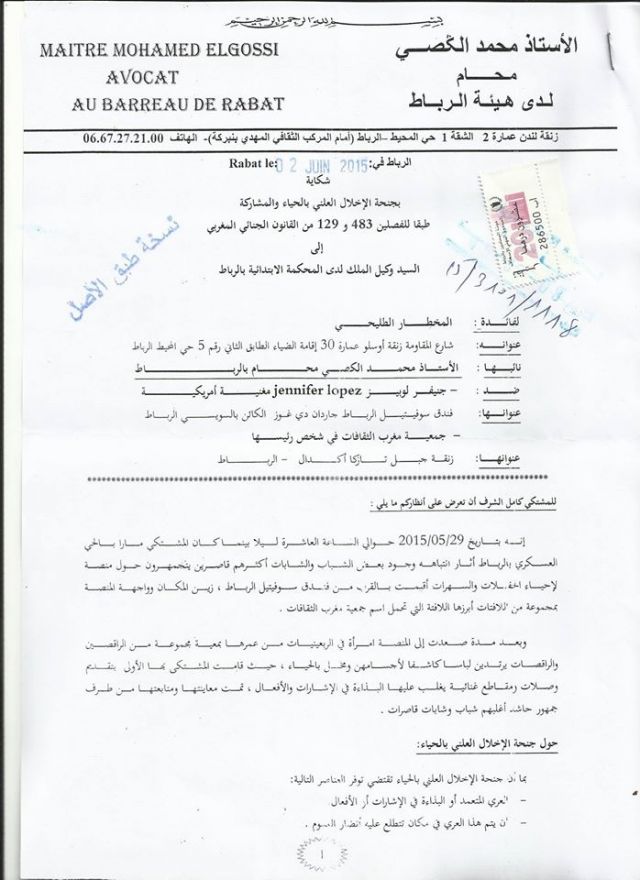 ونشرت صحيفة "أخبارنا" المغربية صورة عن النص الأصلي للدعوى الذي جاء فيه أنه "بتاريخ 29/5/2015 حوالي الساعة العاشرة ليلاً، كان المشتكي ماراً بالحي العسكري بالرباط، فأثار انتباهه وجود بعض الشباب والشابات، أكثرهم قاصرين يتجمهرون حول منصة لإحياء الحفلات والسهرات أقيمت بالقرب من فندق سوفيتيل الرباط".