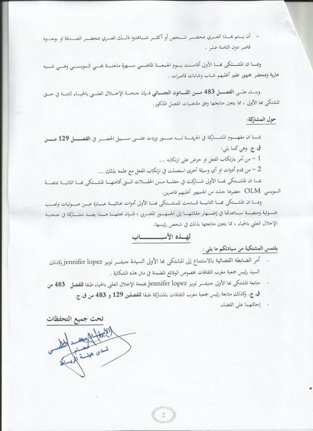 ورفعت الشكوى أيضاً ضد جمعية "مغرب الثقافات" في شخص رئيسها بتهمة المشاركة في الإخلال بالحياء العام وفق الفصل 129 من القانون الجنائي.