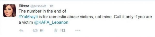 ولكن الرقم لم يكن رقم هاتف اليسا، اذ نشرت تغريدة على حسابها الرسمي توضح فيه أن الرقم الذي ظهر هو رقم جمعية "كفى" المعنية بالدفاع عن المرأة ضد العنف.