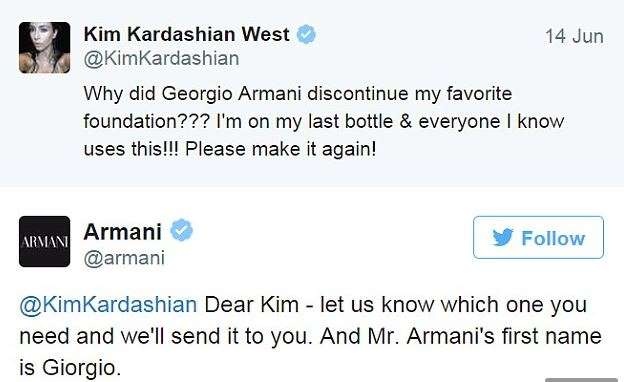 وكانت القصة بدأت عندما لجأت كيم الى "تويتر" يوم الأحد الماضي لتتوجه إلى دار أرماني وتسأل المعنيين لماذا توقفوا عن انتاج كريم الأساس المفضّل لديها، وكتبت: "لمَ سيتوقف جورجيو أرماني عن صناعة كريم الأساس المفضّل لدي؟ أستخدم الآن آخر عبوة متوفّرة عندي، وكل من أعرفه يستعمله أيضاً! من فضلكم أن تعيدوا صناعته من جديد!".