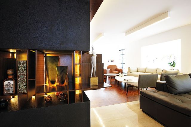 لكنه هنا استخدم الخشب ليكون المستوى أكثر انخفاضاً قياساً ببقية أجزاء المنزل «فأعكس بعد المرور بهذا الصالون مساحة أكثر رحابةً وسقفاً عالياً، وهكذا يشعر المالكان كما الزوار بعد اجتياز هذه المساحة الأولية لندلف إلى بقية قاعات الاستقبال، بانشراح مفعم بالضوء والرحابة».