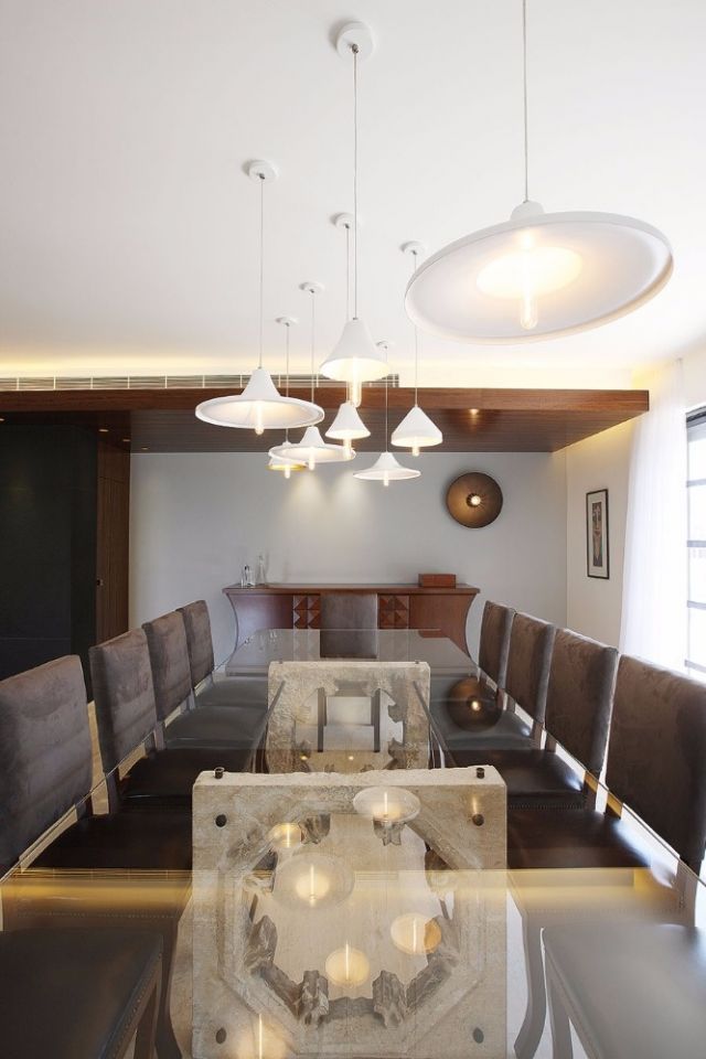 ركن غرفة الطعام أيضاً تملأه الإنارة والحياة، ولكن هنا فقط، الأبواب المطلة على الحديقة تداخلت فيها قطع من الحديد المقسّم إلى المربّعات على غرار الطراز الهندسي الياباني.