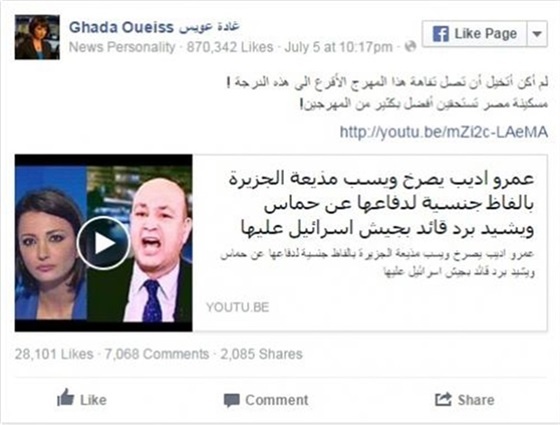 هاجمت المذيعة اللبنانية في قناة "الجزيرة" غادة عويس الإعلامي المصري عمرو أديب، بعد انتقاده طريقة تناولها للهجمات الإرهابية الأخيرة، التي شهدتها سيناء.