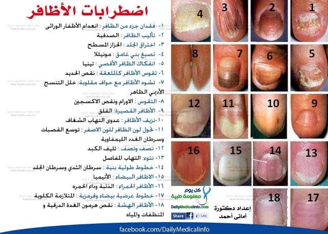 5 - الأظافر المنقطة: وجود نقط على شكل حفر صغيرة على الأظافر قد يكون علامة مبكرة على مرض الصدفية أو ألتهاب المفاصل.