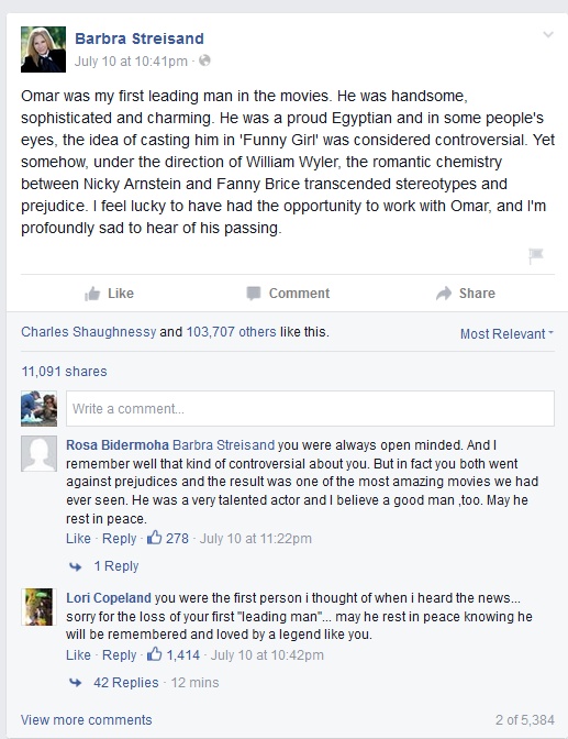 وكتبت سترايساند على صفحتها الشخصية بموقع "فايسبوك": "عمر كان أول رجل يتولى الدور الرئيسي في أفلامي، لقد كان وسيما وأنيقا وساحرا".