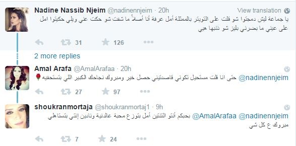 اشتعل موقع "تويتر" بين النجمتين السورية أمل عرفة واللبنانية نادين نسيب نجيم، في حين دخلت النجمة شكران مرتجى على خط "الأزمة".