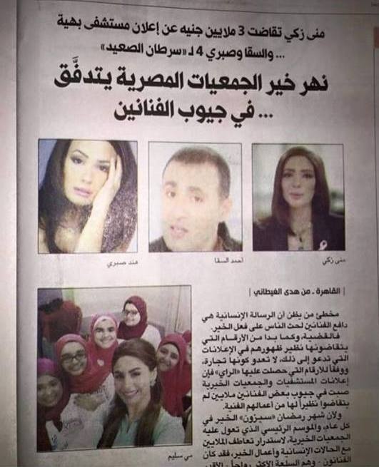 عبرت الفنانة هند صبري عن انزعاجها الشديد من الأخبار التي انتشرت ببعض الصحف والمواقع الإلكترونية، حول تقاضيها أربعة ملايين مُقابل مشاركتها أحمد السقا في تقديم إعلان خيري بهدف التبرع لأحد المستشفيات المتخصصة في علاج السرطان، حيث نشرت صورة من الخبر وكتبت من خلال صفحتها الرسمية على موقع فيس بوك: "هؤلاء الذين يخترعون الترهات؛ لكي يجعلوا فئة من الشعب تحقد على ناس هدفها فقط إسعادهم وتسليتهم؛ بعيداً عن الهموم اليومية، كيف تنامون الليل؟ وكم قبضتم أنتم لتشويه سمعتنا؟ حسبنا الله ونعم الوكيل، سأتكلم بلساني وبلسان كل زملائي الذين زُج باسمهم في هذا التقرير الخرافي، لأَنِّي أعرفهم جيداً وأعرف أن تقاضيهم أموالاً للدعاية لمؤسسات خيرية مستحيل، أنا وأحمد السقا لم نتقاض مليماً واحداً من أجل الدعاية لمستشفى شفا الأورمان، لم يأتِ حتى ببالنا المطالبة بأجر. وأنا متأكدة أن هذا المبدأ يسري على كل الزملاء. يعني نعمل حاجة يشوهونا ما نعملش يشوهونا! اتقوا الله!".