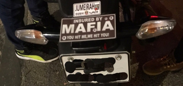 وأفاد بأن الدراجة التي استخدمت أثناء توجيه الإشارة المخلة كانت تحمل لوحات متنوعة، كتب على إحداها كلمة "مافيا"، وعبارة "إذا آذيتني سوف أؤذيك"، مشيراً إلى أن "هذه الملصقات في حد ذاتها تمثل مخالفة مرورية".