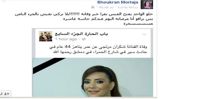 سخرت النجمة السورية شكران مرتجى من خبر وفاتها الذي نشرته إحدى صفحات "فايسبوك"، مشيرة إلى أن السبب حادث سير في شارع الحمراء بالعاصمة السورية دمشق.