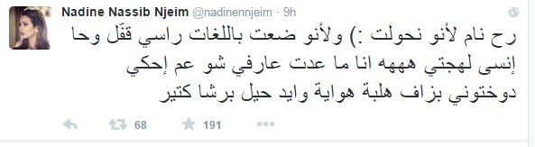 تعرضت النجمة اللبنانية نادين نسيب نجيم إلى وابل من التغريدات من مختلف البلاد العربية بتنوع لهجاتها، ما أدى إلى إصابتها بـ"الحول والتنميل"، إلى جانب نشرها صورة مع ابنتها بإطلالة جريئة.