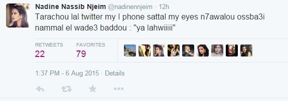 وإزاء ذلك غردت نجيم لاحقاً: "طرشوا للتويتر، جوالي سطّل، عيوني انحولوا، اصبعي نمل، الوضع بدو يا لهويييي".
