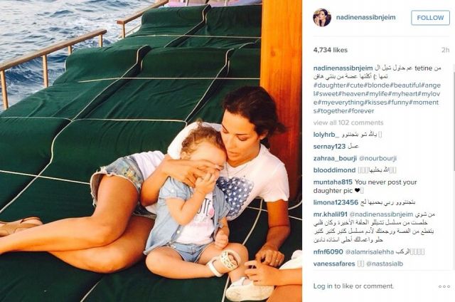 ونشرت نادين صورة لها على "انستغرام" مع ابنتها هيفن معلقة عليها: "عم حاول شيل ال tetine من تمها، اكلتها عضة من بنتي هيفن".