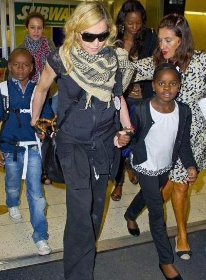 في إطلالتها في مطار "هيثرو" في لندن، ظهرت النجمة مادونا البالغة من العمر 55 عاماً وهي تمسك يديّ ولديها بالتبني "دافيد" 7 سنوات و"مرسي" 7 سنوات، وتمشي إلى جانبها ابنتها البيولوجية لورد البالغة من العمر 17 عاماً.