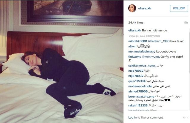 وبدت اليسا في الصور على عفويتها تنام على سريرها الخاص، مرتدية بيجاما سوداء وعلقت على الصورة قائلة "تصبحون على خير"، وحققت الصورة أكثر من 24 ألف "اعجاب" في أقل من 10 ساعات.