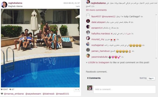 وعلق النجم اللبناني على احدى الصور قائلاً: " تحت شمس تونس الذهبية مع قسم من فرقتي الموسيقية ووقت جميل على المسبح"، وكتب على صورته مع اولاده خالد ولؤي "نقطة ضعفي الوحيدة".