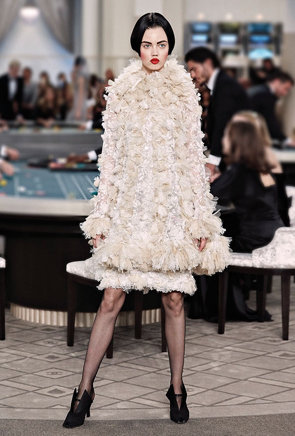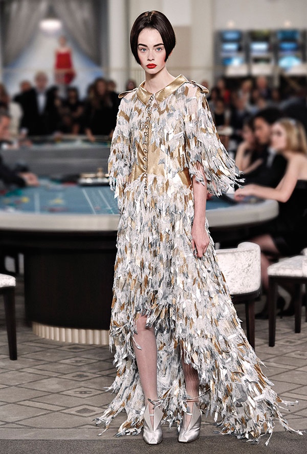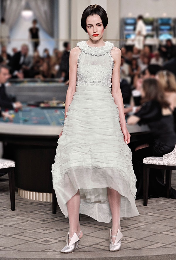 ولأزياء الحفلات، ظهرت فساتين غير متماثلة الطول ضيقة عند الخصر لتنسدل متسعة في الجزء السفلي أو تنتفخ في هذا الجزء المذكور أو تتدرّج من طبقة إلى أخرى. فساتين من دانتيل أو حرير أو رافيا أو تول أو أورغنزة أو تفتا أو شيفون، وقد زينتها الريش المتلألئة، أو الزهور المصنوعة من القماش، أو أضاءها البرق اللمّاع، كل ما يليق بأنوثة تبرز برقيّ من دون ابتذال أو استعراض. هذا ما أكدت عليه تسريحات العارضات الحادة والبعيدة عن الأنوثة الطاغية، بل الصبيانية القصيرة، والماكياج القوي الواضح الذي يبرز القسمات ولا يخفي تفاصيلها. أما الأحذية فبدت كأنها مغلّفات مفتوحة، أنيقة وراقية. وانتعلت كلّ من العارضات جزمة قصيرة برباط خلف الكاحل وكعب هندسي الشكل. أما «بذلة» العروس، التي عرضتها كينديل جينير، فهي توكسيدو مصنوع من الساتين الأبيض، تتدلّى منه طرحة من التول تزينها كاميليا مادوموازيل شانيل.