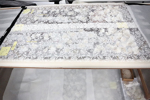 يتم تحويل الرسم أولاً إلى تصميم من قماش كتان، لتعاد خياطة التصميم بالأقمشة التي اختارها الاستوديو، وهي في هذه الحالة القماش المخرم وتول الحرير. يجري بعدها إرسال القماش المخرم وتول الحرير إلى محترفات Lemarié.