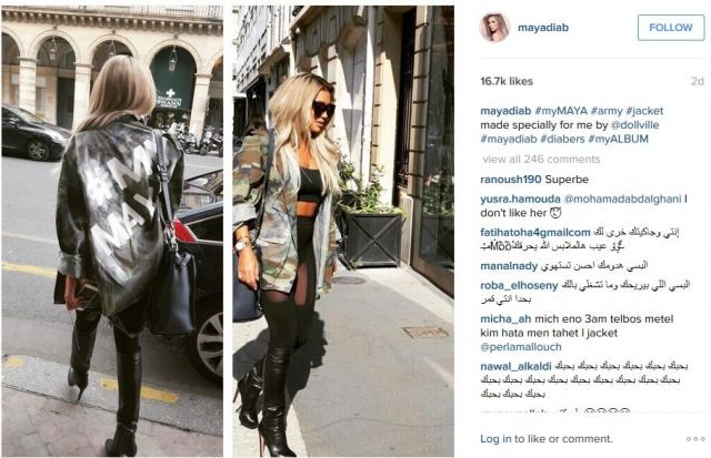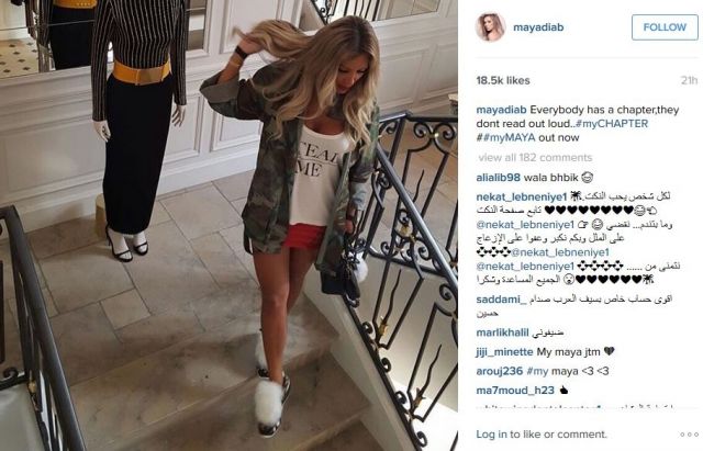 وعلقت مايا على إحدى الصور قائلة: "سترة عسكرية صممت خصيصاً لي". ونالت الصور كمّ كبير من الاعجاب والتعليقات التي لم يخلُ بعضها من الانتقاد بسبب إطلالتها، نظراً لملابسها الجريئة التي ارتدتها تحتها والتي لا تليق بالسترة العسكرية.