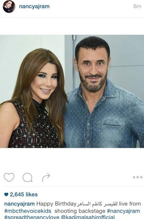 عبر موقع انستغرام نشرت النجمة اللبنانية نانسي عجرم صورة تجمعها بالقيصر كاظم الساهر احتفالاً بعيد مولده الذي يصادف اليوم. وكتبت نانسي تعليقاً على الصورة التي التقطت في كواليس the voice kids: عيد ميلاد سعيد كاظم. مباشرة من كواليس ذا فويس.