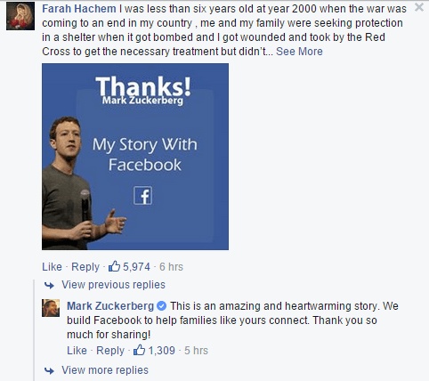 بعد تعليق هاشم، انهالت الاعجابات والتعليقات التي تطالب زوكربيرغ بالاطّلاع على قصّة فرح، ومنها من موظّفي "فايسبوك" أنفسهم، وكانت المفاجأة أن زوكربيرغ ردّ شخصياً، وقال لها إن "هذه القصّة مذهلةٌ وحميمة. لقد بنينا فايسبوك لمساعدة العائلات مثل عائلتك على التواصل. شكراً جزيلاً لك على مشاركة هذه القصّة".
