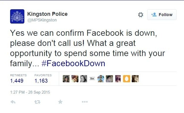 وقالت الشرطة على حسابها الرسمي: "نعم نستطيع تأكيد أن موقع فايسبوك معطل، الرجاء عدم الاتصال بنا. حاولوا قضاء بعض الوقت مع عائلاتكم".