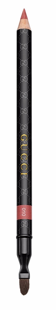 حددي شفتيك بقلم Gucci Sleek Contouring Lip Pencil in Rose Dragee ، وغلفيهما بأحمر الشفاه Lancome L'Absolu Rouge in Rose de Ville no. 305 .