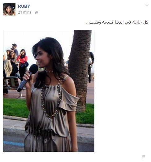 ونشرت روبي في صفحتها الرسمية على موقع "فايسبوك" صورةً لها، معلقّة عليها: "كل حاجة في الدنيا قسمة ونصيب".