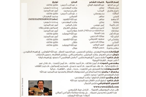 "إلى عرّاب الموسيقى العربية الراحل عمّار الشريعي هذا العمل لم يحمل اسمك لكنه روحك ساكنة دائماً في أعمالي... أخوك عبد الله الرويشد" بهذا الإهداء الذي خطّه على غلاف ألبومه الجديد، توجّه سفير الأغنية الخليجية الفنان عبد الله الرويشد إلى الراحل عمّار الشريعي في لفتة منه إلى تكريم هذا الموسيقار الذي طبع الوسيقى العربية بفنّه.