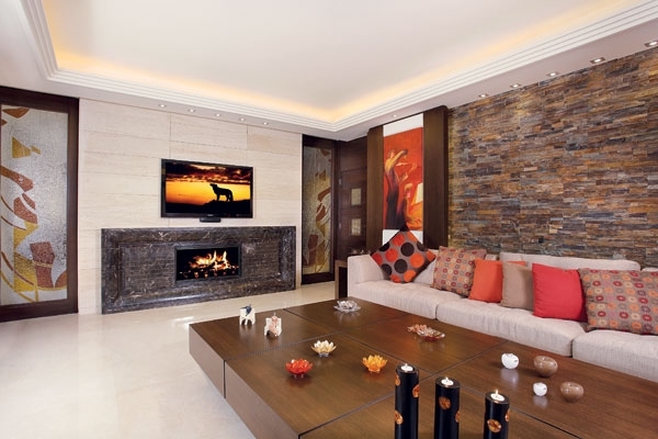 المدفأة وضعت بدورها على حائط من الحجر الأبيض، وهي تطلّ من الجهة الخلفية للجدار على جلسة أخرى زينتها بجمالية فائقة.