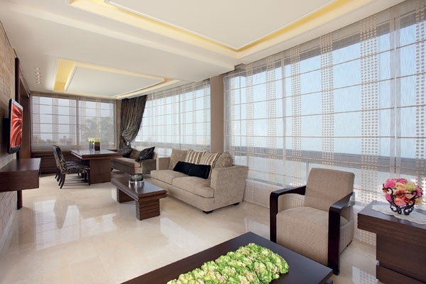وصمّمت الستائر الشفافة من الوسط والجوانب من الحرير، لإظهار أكبر مقدار ممكن من المنظر البانورامي الخارجي.