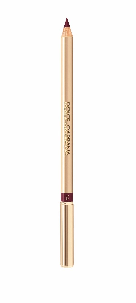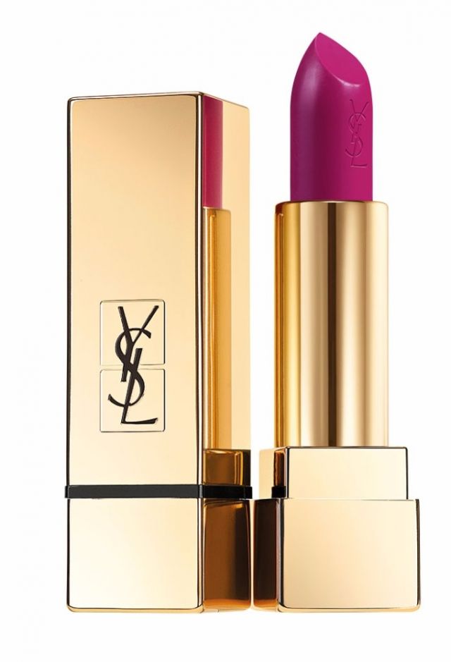 حدّدي شفتيك بقلم Dolce & Gabbana Precision Lipliner in Desire no.14، وغلفيهما بأحمر الشفاه الفوشيا الجريء Yves Saint laurent Rouge Pur Couture N°19.