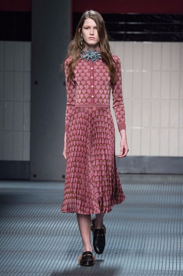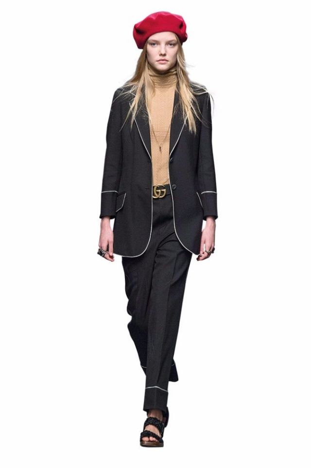 أما بلوزة الحرير باللون الأزرق المخضرّ مع الشريط الأسود المعقود فهي بلا شك قطعة لافتة للنظر في مجموعة غوتشي. ارتدتها مولي بلير بكل ثقة مع سروال متهدّل. هذه البلوزة هي من اللوازم الضرورية في خزانة خريف وشتاء 2015/2016. المعاطف الكبيرة الحجم رائجة أيضاً هذا الموسم، ويقضي أسلوب غوتشي بارتدائها مع أوشحة حريرية ساطعة عتيقة الطراز. إنها طلة أنيقة وجميلة تناسب كل الأعمار. أما الأحذية المغطاة بالفرو فقد تكون متطرفة بعض الشيء، لكن لمسات الفرو رائجة جداً في الوقت الحاضر وتبدو رائعة على الحقائب والقبعات والمعاطف. وبالنسبة إلى طلة البذلة الرسمية مع الكنزة ذات الياقة المقلوبة التي ارتدتها روس أبيلز فهي أيضاً سهلة الارتداء. قد تفضلين الاستغناء عن الصندل في أشهر الشتاء، لكننا ننصحك باعتماد الشعر الأملس مع القبعة القرمزية. ولا شك في أن الماكياج الحيادي يتماشى جيداً مع هذه الأجواء الغجرية.