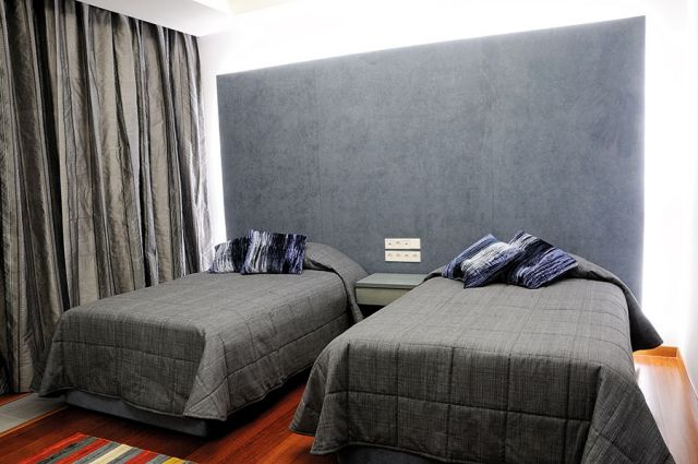 أما غرف النوم فنصل إليها عبر أروقة مميزة، مزدانة بلوحات وخطوط خشبية تؤلف خزانات كبيرة بين السقف والأرض، فيبرز التنسيق التام بين الألوان والجدران والخشب المنجد بالقماش، ويتناغم ورق الجدران مع أغطية الأسرّة وصولاً إلى الستائر.