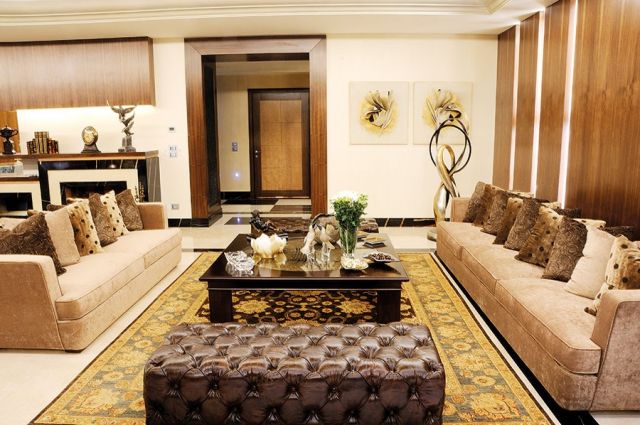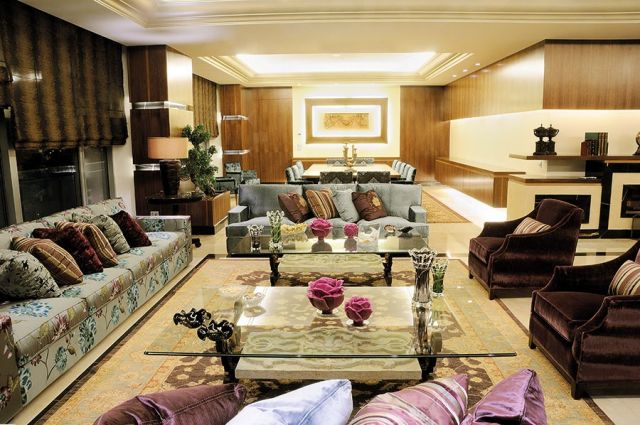 يتقدم الصالونات طاقم مؤلف من كنبتين كبيرتين متوازيتين، بألوان البيج والبني. وفي الوسط، تتموضع طاولة خشبية مربعة الشكل تزيّنها أكسسوارات شفافة من الكريستال، كما يطل مقعد جلدي معزز بأزرار مغروسة ليلتقي مع صالون خاص بـ «السيغار» حيث ازدان جدار خشبي بالرخام يداخله اللون الأسود، وحيث التلفزيون معلّق لتظهر أمام الرائي المقاعد الجلدية الدافئة وكنبة كبيرة بألوان زهرية، وأرائك مخططة.