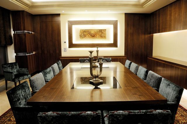 وتشغل الجدران لوحات خشبية تسكنها إنارات خفية، إضافة إلى لوحة كبيرة بين الجدران يمكن تحريكها فينكفئ معها جزء من الجدار نحو المطبخ لتسهيل الخدمة.