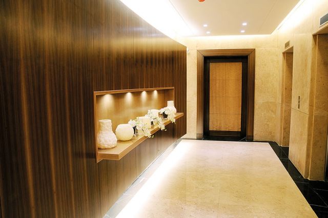 غطّت الجدران أعمال خشبية داكنة اللون، بينما اتحدت الأرض الرخامية مع لون السقف الفاتح.