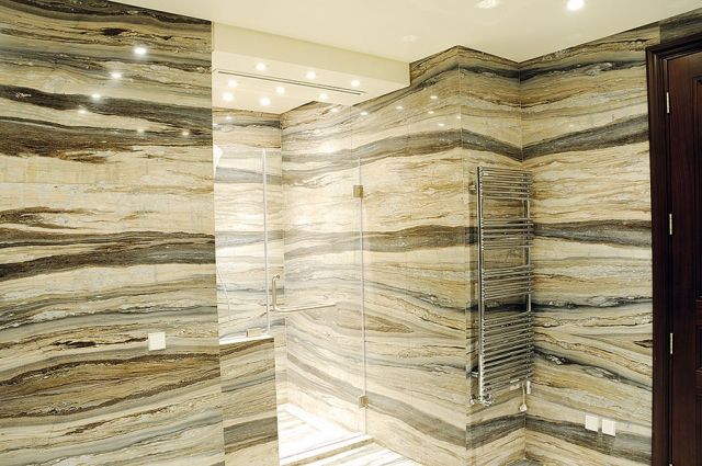 تمّ تلبيس الحمامات بالرخام الذي غَيّب عنها زحمة الأكسسوارات لتبدو شفافة في حضورها، فازدان حمام الضيوف بالحجر الأسود (تالانوار) الذي برز راقياً ولماعاً مع تجهيزات المكان من مغسلة وكرسي... أما سائر الحمامات في غرف النوم فاكتسب الخشب فيها جماله إلى جانب الرخام المخطط بتموجات بحرية بألوان الأزرق والبيج والبني مع الأبواب الزجاجية الشفافة التي تبرز حضور الرخام بقوة.