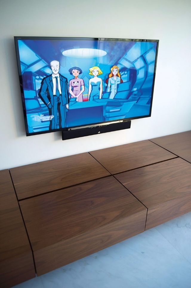 أحد جدران هذا الصالون مزدان بالخشب والحديد، ويبرز في وسطه تلفاز معلّق على خطوط حديدية، بينما تمتد مدفأة من الحديد على طول الجدار لتضيء عتمة الليل وتبعث الدفء في أرجاء المكان.