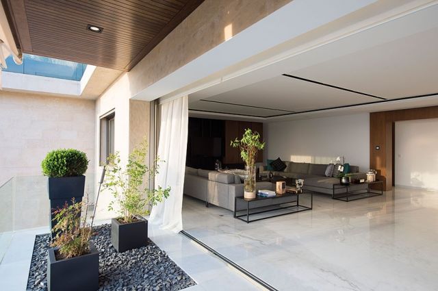 غطى الرخام الأبيض من نوع الـ «بيانكو بي» الايطالي أرض المنزل كافة، باستثناء المطبخ الذي امتد فيه «الترافرتينو» باللون الفضي.